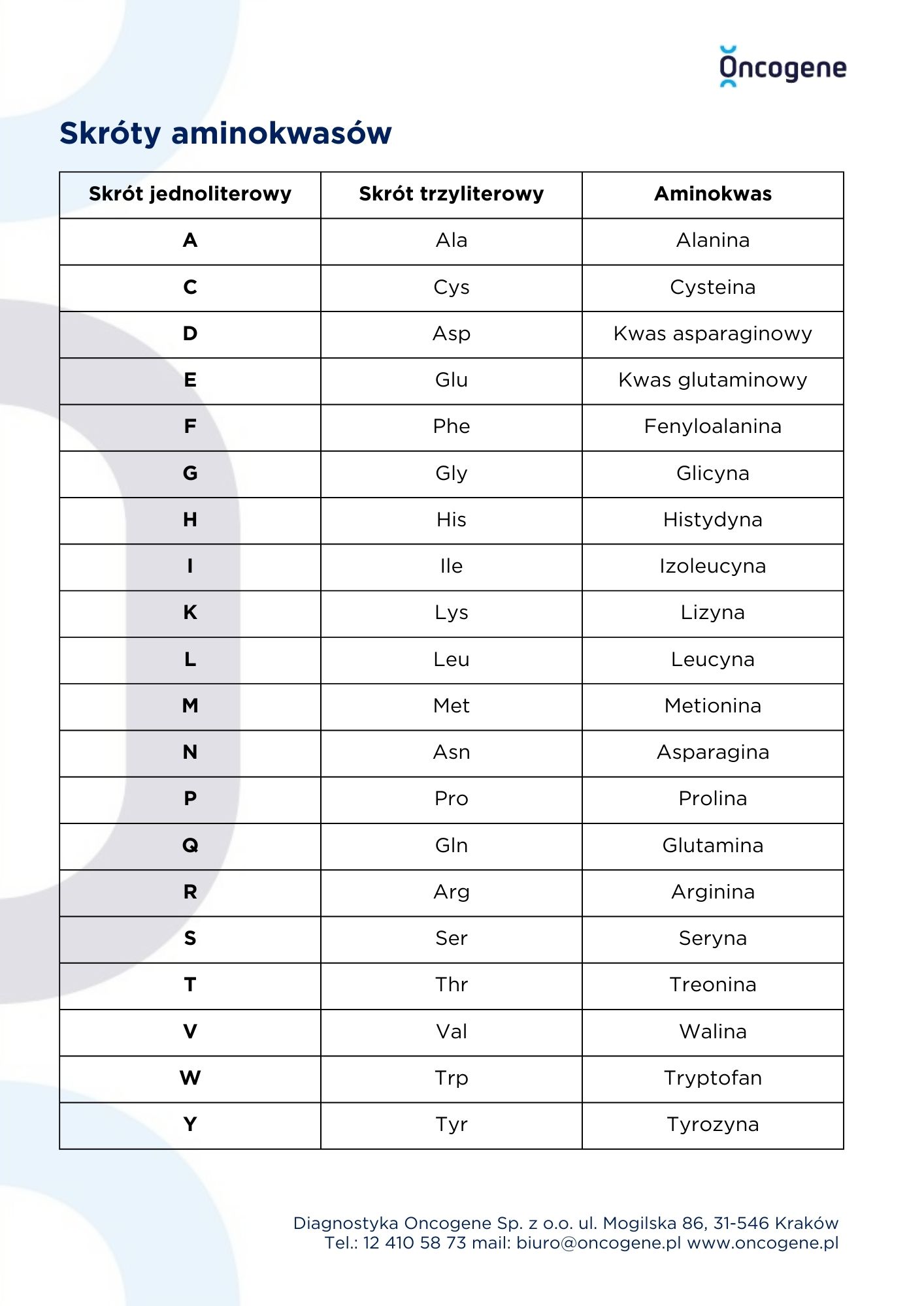 W załączeniu znajdują się dwie alfabetyczne tabele aminokwasów wg skrótu jednoliterowego i trójliterowego. Tabele mogą pomóc z odczytywaniem zapisu mutacji. Zapis trójliterowy jest rekomendowany przez HGVS, natomiast potocznie używa się zapisu jednoliterowego (m.in. w charakterystykach leków).